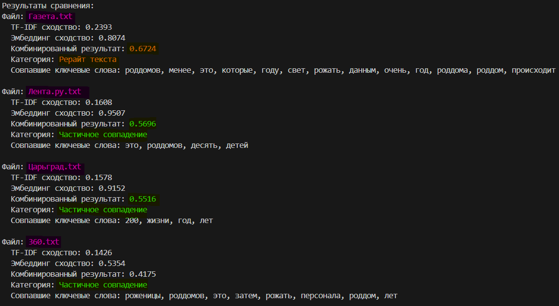 Инструмент для анализа текстов, определяющий степень их сходства на основе частотного, семантического и ключевого анализа (самописное решение на основе предобученной модели). Первоначальное предназначение – выявление дубликатов одной и той же темы в рамках одного издания, поэтому анализ сходства очень притязателен.