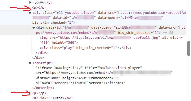 Посмотрел у себя этот мифический тег P. Ничего такого не обнаружил - видео в него не обернуто. Единственное, что перед iframe стоят парные пустые теги p (отметил на скриншоте), но они даже в теории ни на что не могут повлиять, потому что это обычные абзацы.