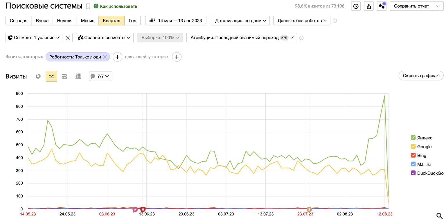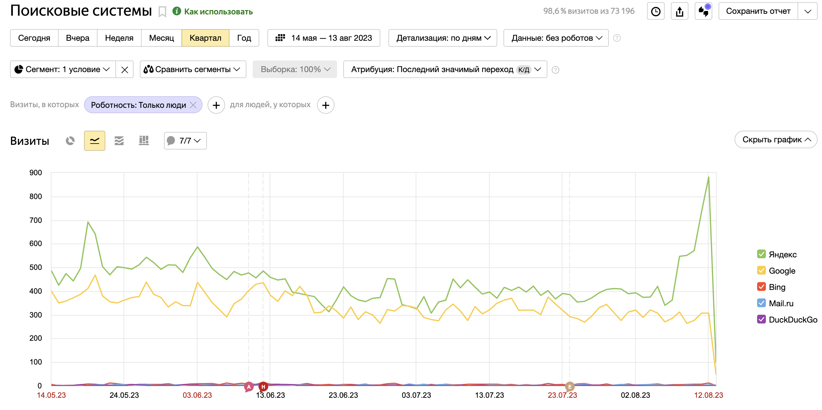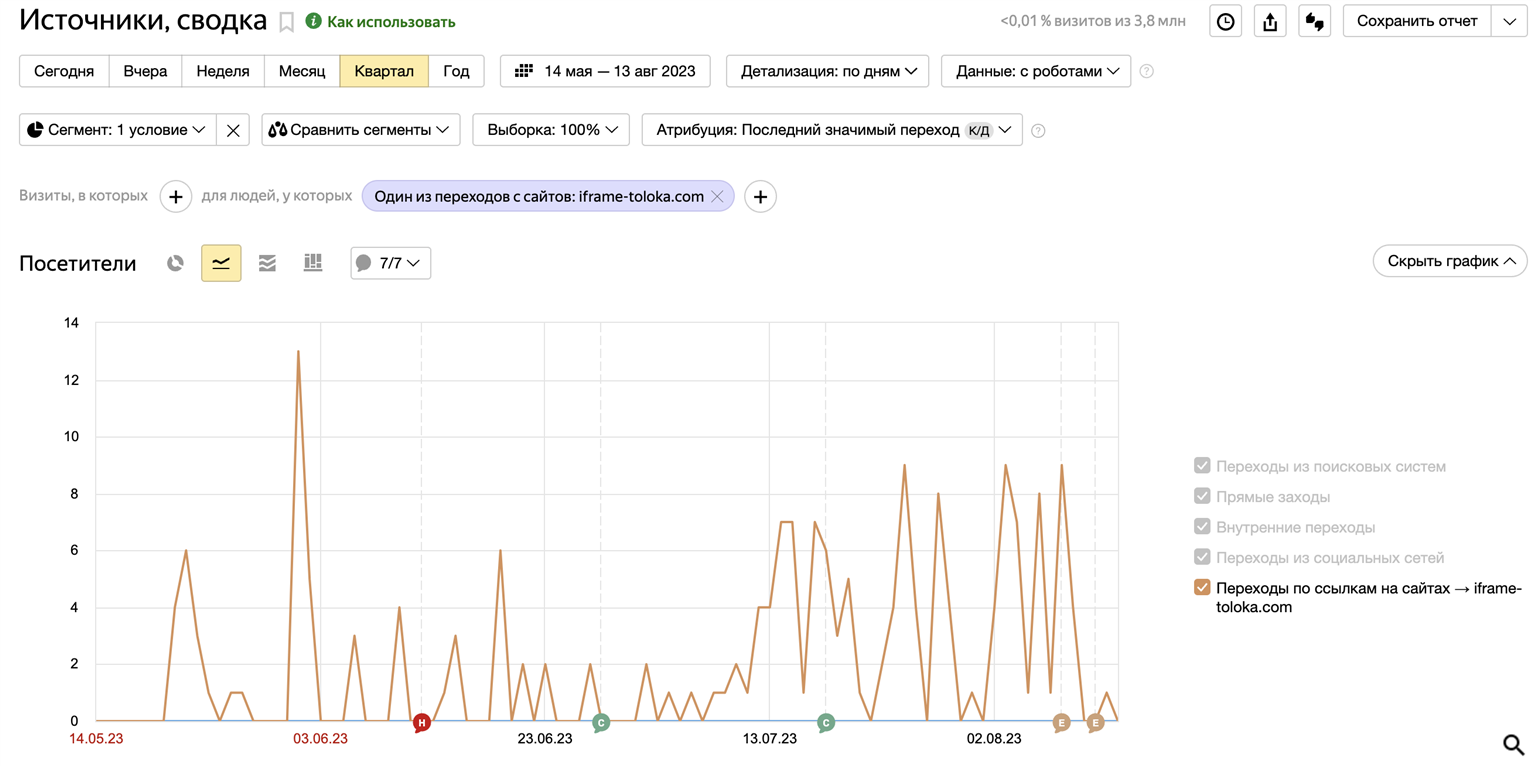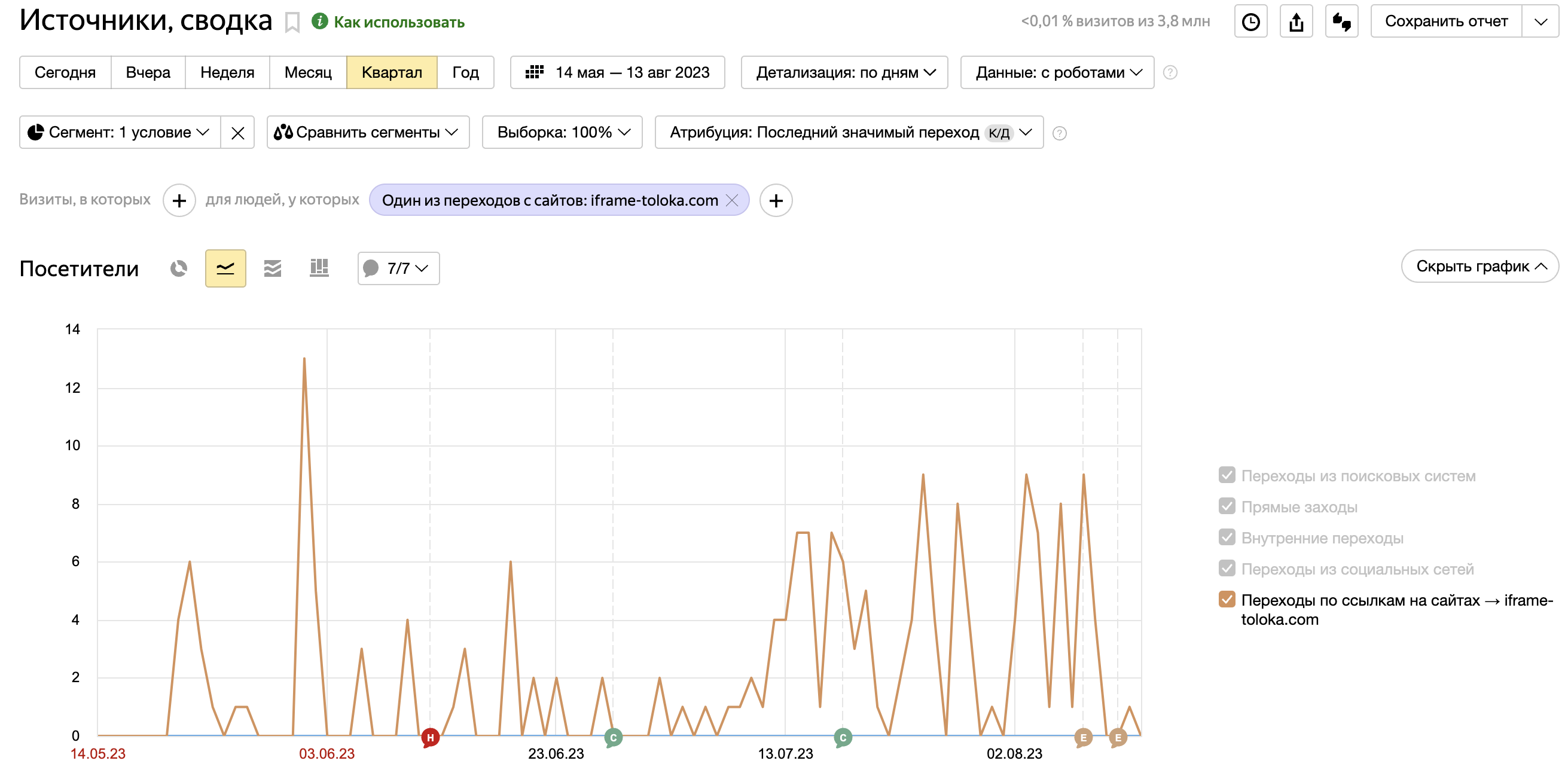 Попробовал отсмотреть в вебвизобе визиты толокеров. Информативности никакой. Все заходы с ПК, максимум что можно было бы предположить — считали количество рекламных блоков. Один заход был с мобилки, там само собой сразу Fullscreen выскочил, а после его закрытия был Floor Ad. Может дело в этом и всё таки по рекламу толокеры бродили по сайтам? Но как-то тупо за такое банить, это ж не мой формат, а РСЯ такие форматы внедрил. Правилами не запрещено вместе их использовать. Может они типа проверяли на наличие рекламы в первом экране? Но опять же, с вышеупомянутыми блоками это нормально.