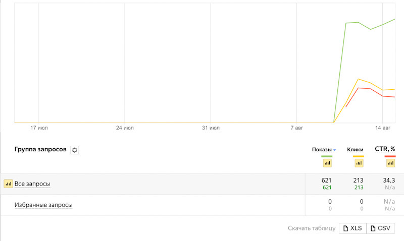 В Google статистика примерно такая же, только показов больше. Никаких ссылок, совсем. Работает исключительно ключ в домене и текст на главной странице, все.