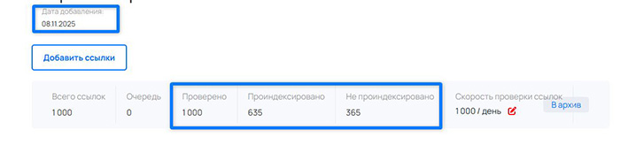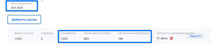 Рандомная выборка 1000 ссылок из различных проектов Заказчиков. Средний показатель индексации 70-80%