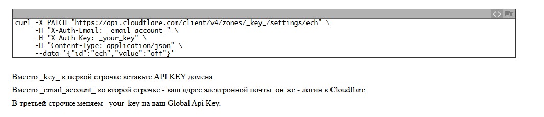 curl -X PATCH "https://api.cloudflare.com/client/v4/zones/{ID_ZONE}/settings/ech" -H "Authorization: Bearer {API_KEY}" -H "Content-Type:application/json" --data '{"id":"ech","value":"off"}'