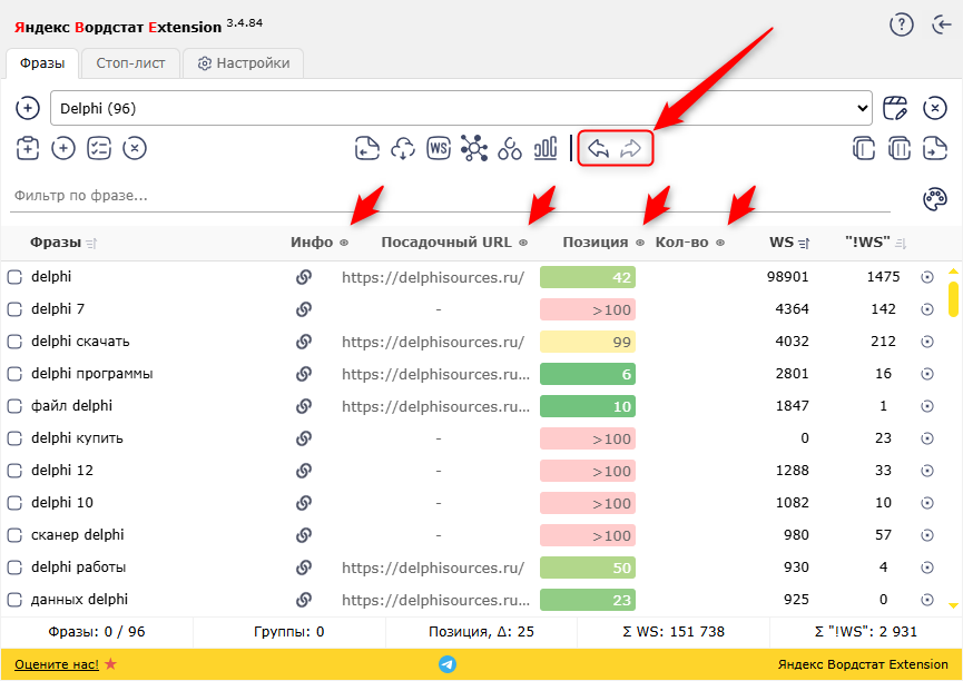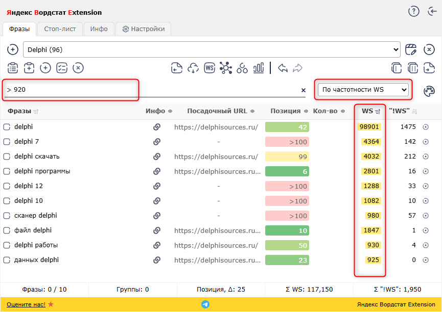 Добавлена возможность пакетного сбора семантики из Яндекс Вордстат, добавлено удаление выделенных фраз по стоп-листу.