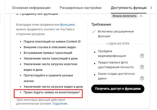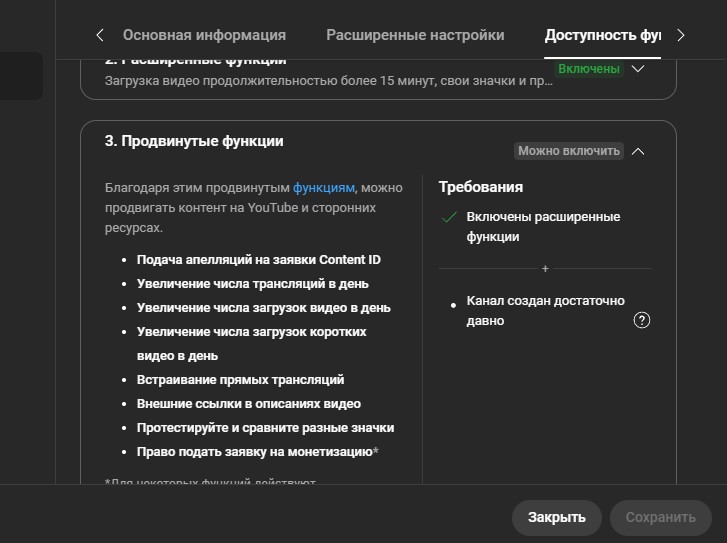 Как включить продвинутые функции YT? Показывает, что можно включить.