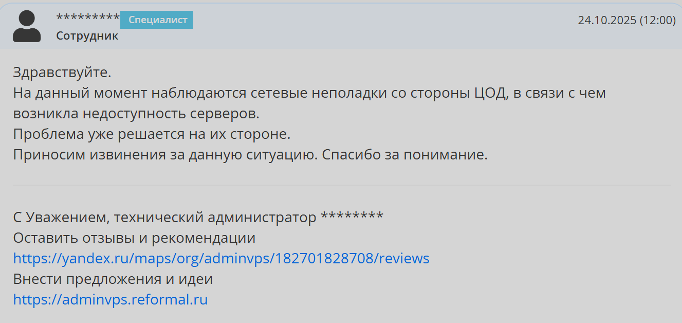 То есть ответы техподдержки, что там проблемы с дата-центром в Текстильщиках Вас не смущают)? Это у нас "что-то" происходит не так)?
