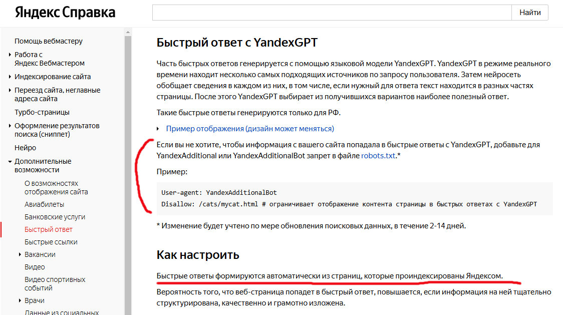 Речь идёт конкретно про быстрые ответы, а не про индексацию сайта.