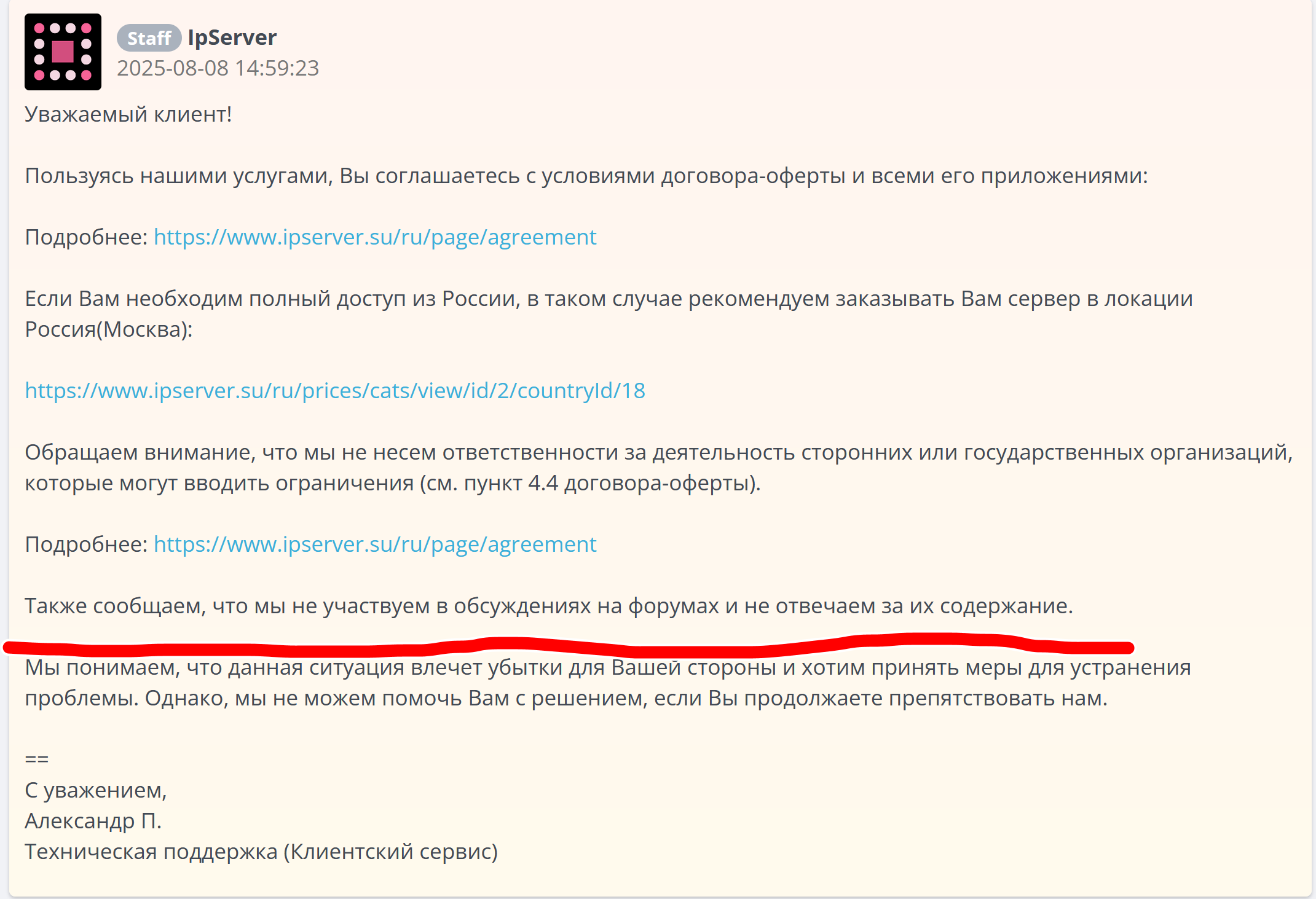 2. 16 августа 2025 я опубликовал переписку со службой поддержки ipserver.su в этой теме. После чего мне отключили виртуальный сервер, который я также брал у этой компании, который раньше работал и к которому вопросов не было. Виртуальный сервер был оплачен до 31 августа 2025.
