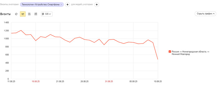 Я не вижу траблов с мобильных посетителей с Нижнего Новгорода. Я привел даже график, что всё, как обычно за 3 квартала, только сезонное падение летнее...