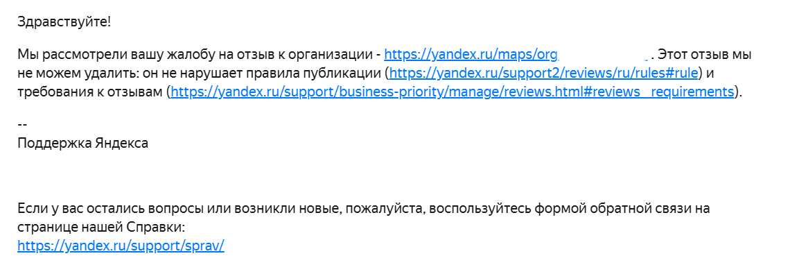 "Перепроверили отзыв. Вы правы, сейчас он не соответствует правилам. Мы его удалили. Он исчезнет через 1–3 дня. Подождите, пожалуйста."