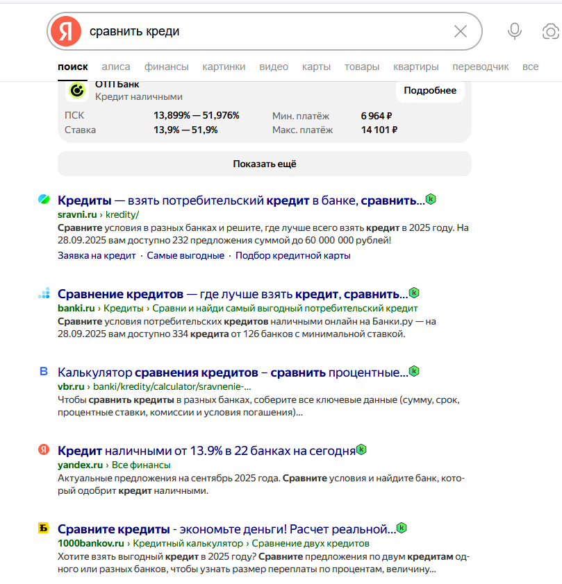 Один скрин с гугла. И то банки ру выше и тематика страховка. А я спрашивал про кредиты или займы, где сравни ру вообще нет