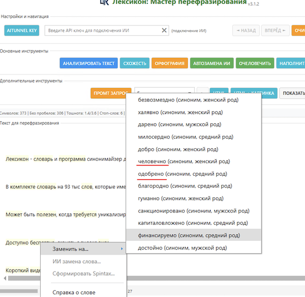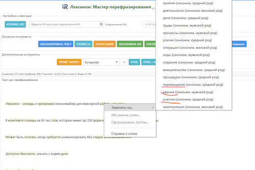 Неужели ты думаешь, что я тебе поверил? Достаточно прогнать твои тексты через морфологический анализ, чтобы понять, что серьезными алгоритмами там и не махнет. А в результате того, что ты используешь синонимы синонимов, получается нечитаемый текст. Любой язык подчиняется определенным правилам - грамматическим, морфологическим и проч. твои тексты это полностью нарушают. У тебя нет контроля вариантов, то есть у безграмотного Васи и выйдет чепука, академик Иванов напишет нормальный текст, но он его и без Лексикона напишет.