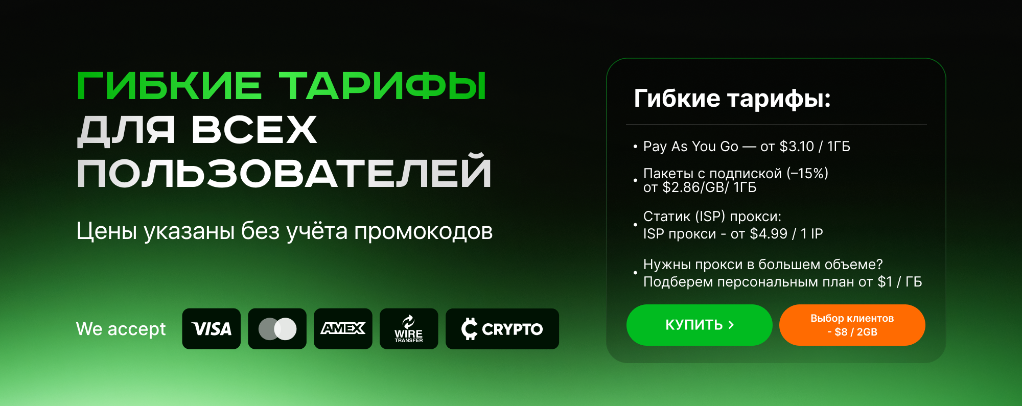 Планы от $1.85 / 1 ГБ. Оплата криптой и картой.