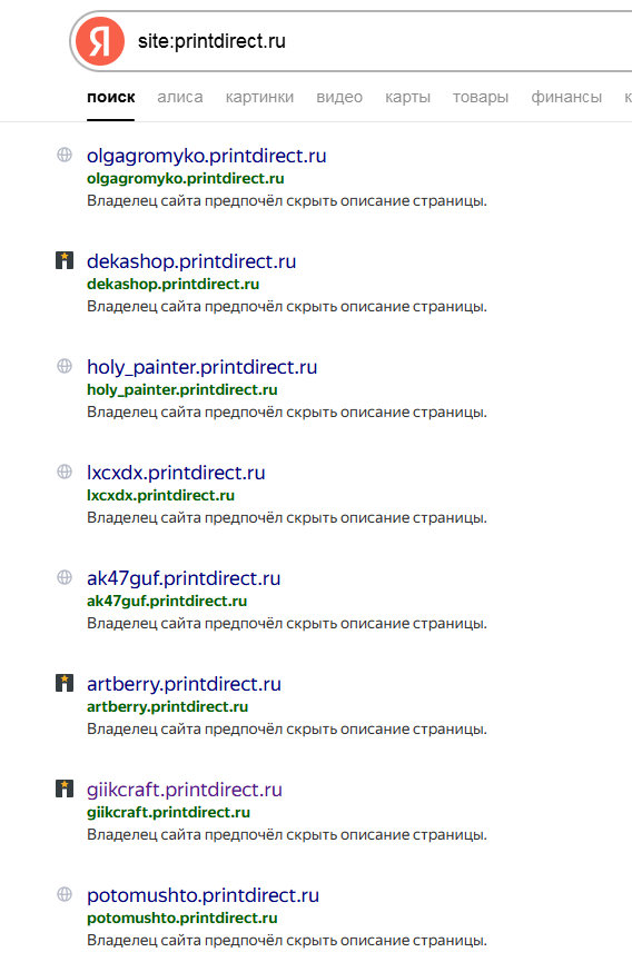 Всё он нормально отдаёт, просто сначала поддомены. Поменяйте на site:printdirect.ru printdirect.ru
