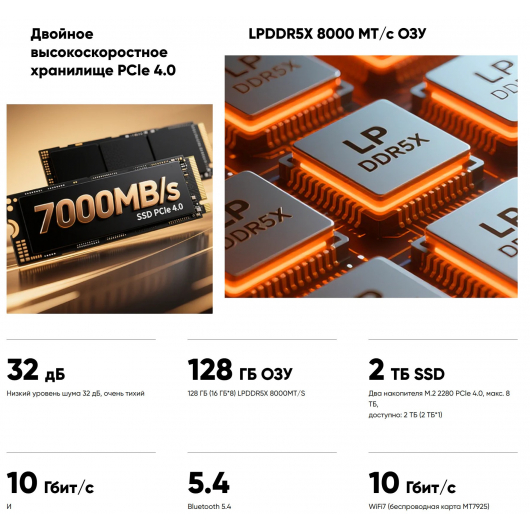 Благодаря 128 ГБ оперативной памяти LPDDR5X-8000 и двум слотам M.2 2280 PCIe 4.0 (с поддержкой до 8 ТБ) GTR9 Pro неттоп обеспечивает молниеносную скорость для ИИ, игр и творческих задач. В комплект поставки входит твердотельный накопитель емкостью 2 ТБ со скоростью до 7000 МБ/с.