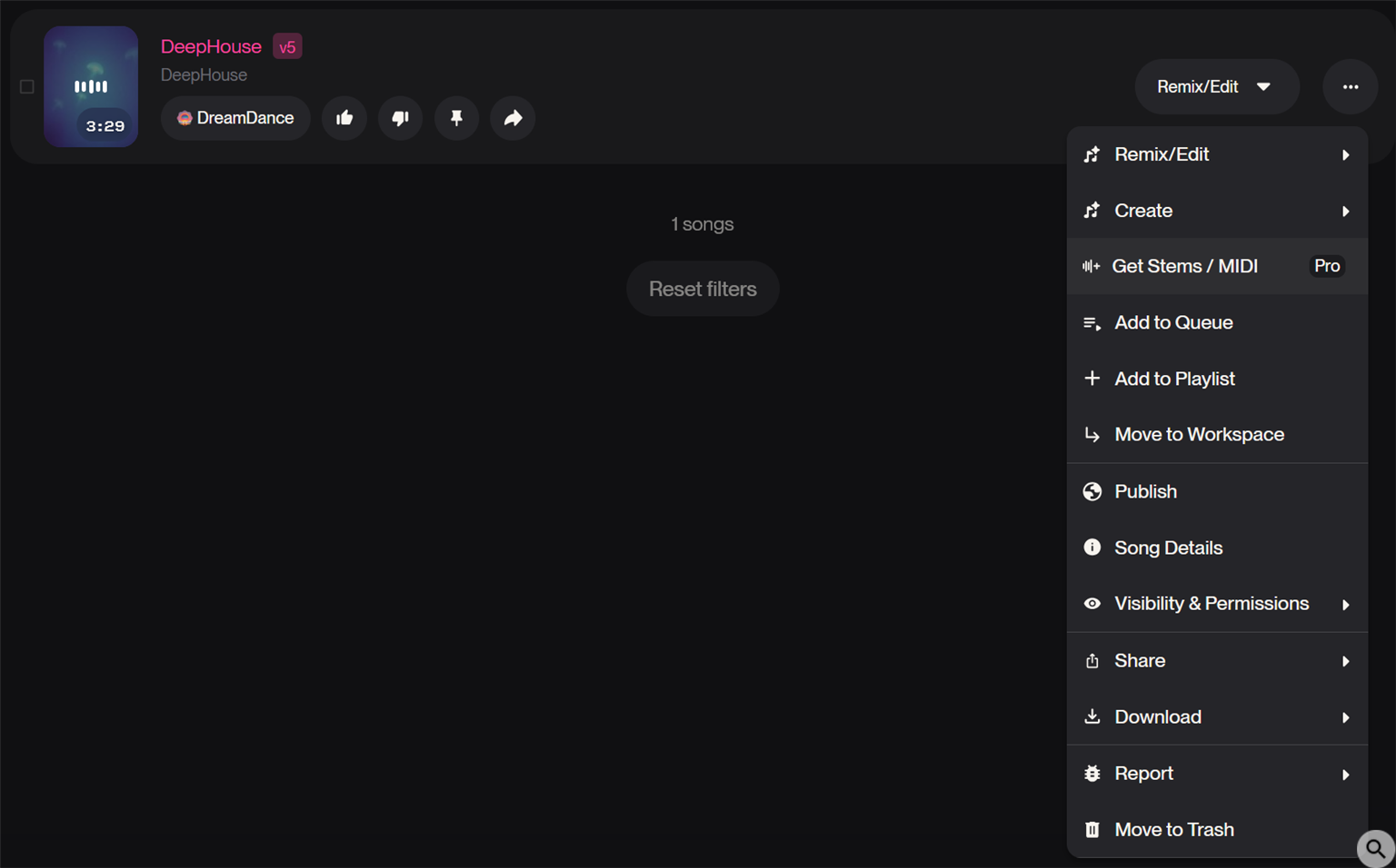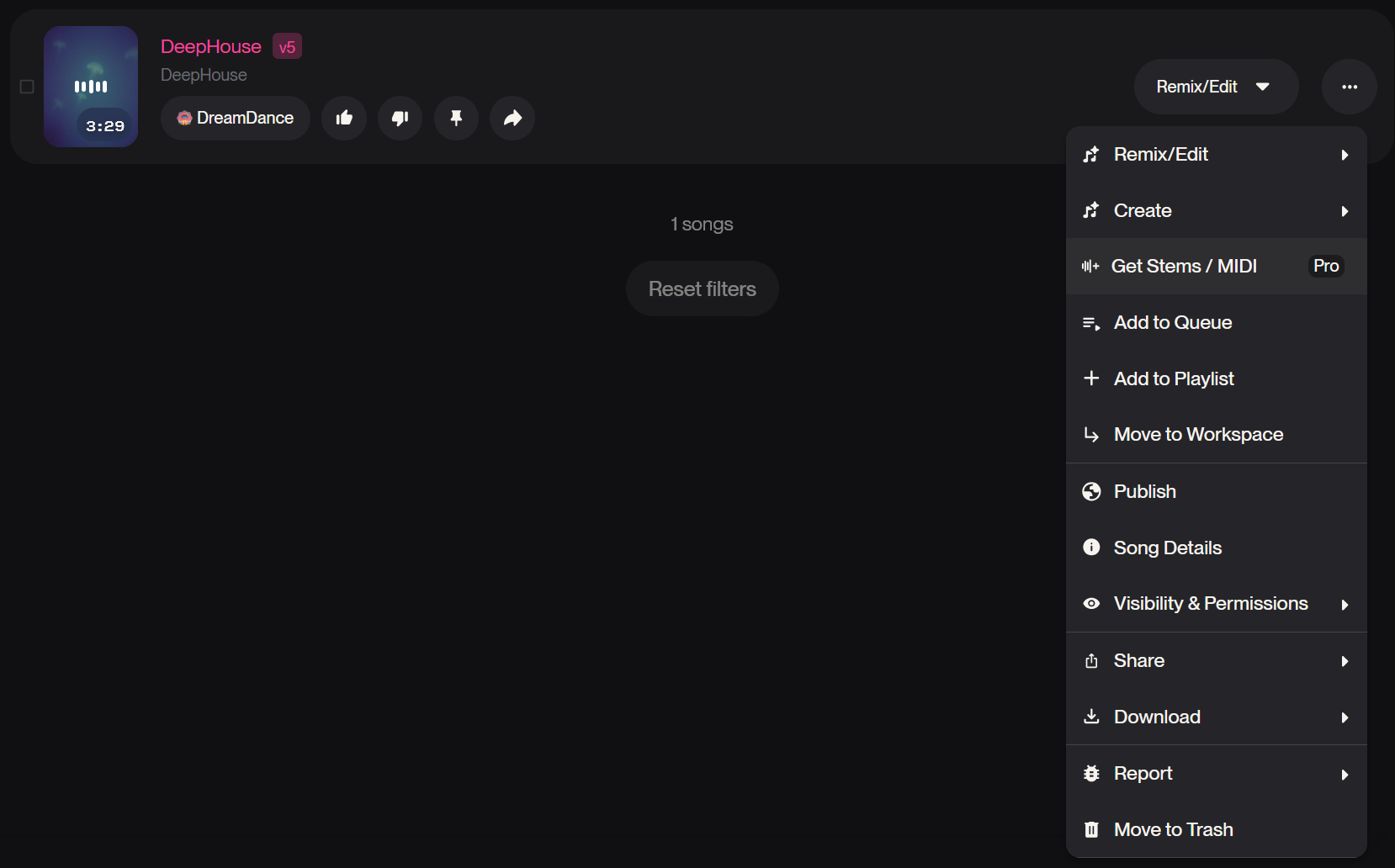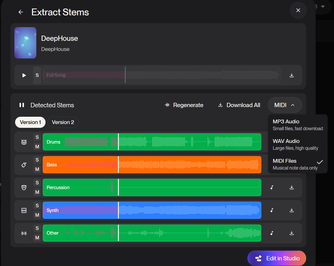 Имея про аккаунт на Suno.com можно вполне делать экспорт в MIDI, но качество распознавания сейчас зависит от простоты мелодии (чем проще, тем лучше), например, есть исходный трек "DeepHouse.mp3", зааттачил для примера: объясняю как сделать экспорт в миди, это даже без студии (studio) можно сделать, жмём три точки, далее выбираем Get Stems/MIDI: