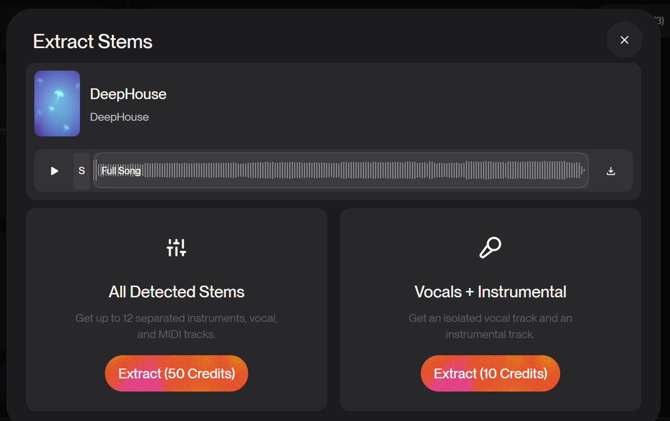 жмём под "all detected stems" кнопку "Extraсt (50 Credit)", далее ОНО думает... и появляется окошко с распознанными дорожками, получаем вот такую картинку: