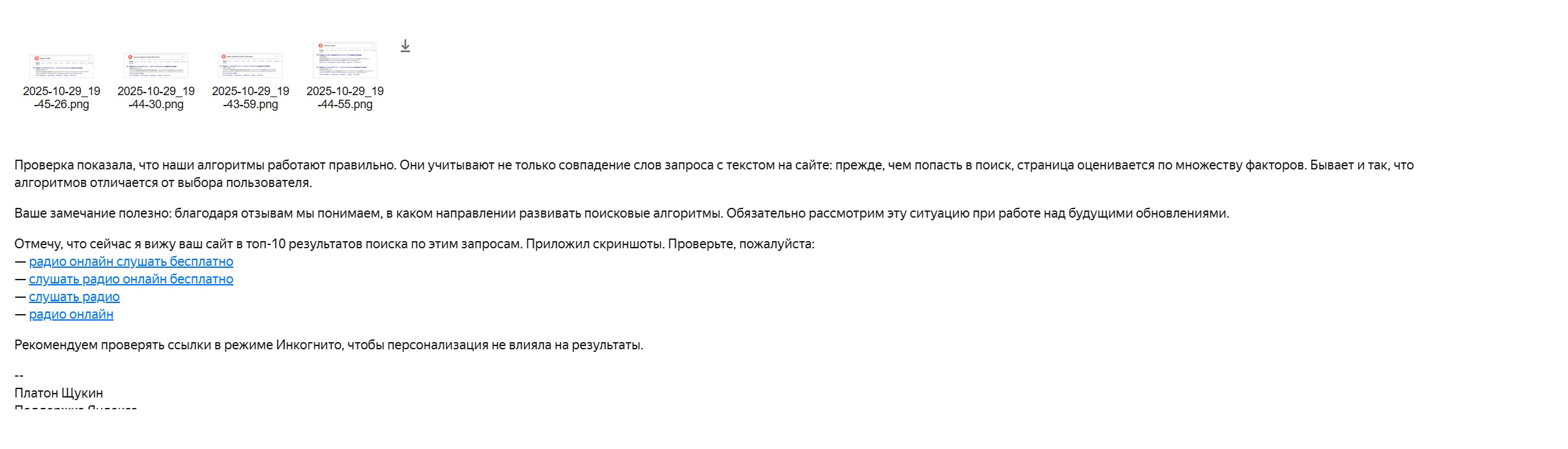 Так вы сами читали ответ? Меня ответ Яндекса полностью устраивает. А вы над ним даже не призадумались. Мне, как пользователю, вообще безразлично, на какую страницу вашего сайта я попадут, так как на той странице, которая сейчас в выдаче, я найду онлайн радио. Но вы упорно не хотите это признать.