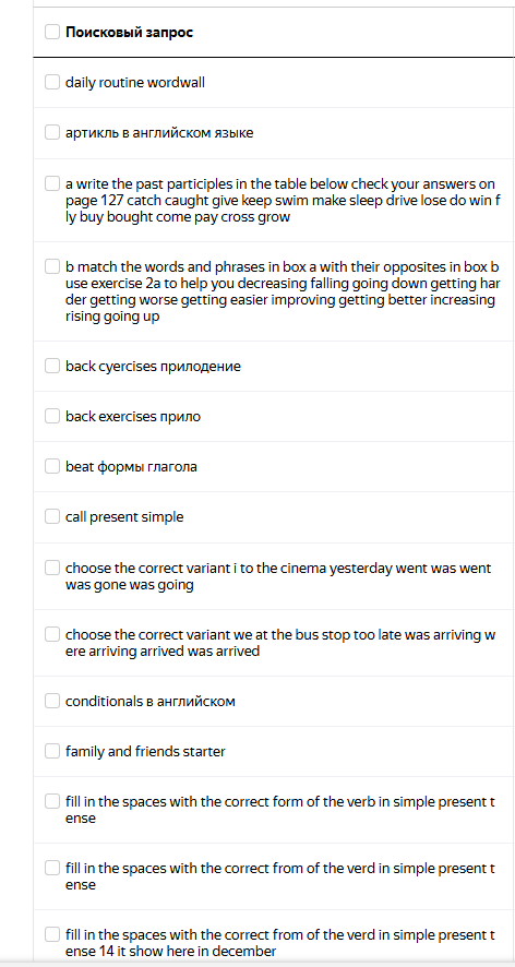 А показы пошли по таким мусорным поисковым запросам как например предложения на английском из учебника и прочий мусор, из всех поисковых запросов релеватных было 2-3.