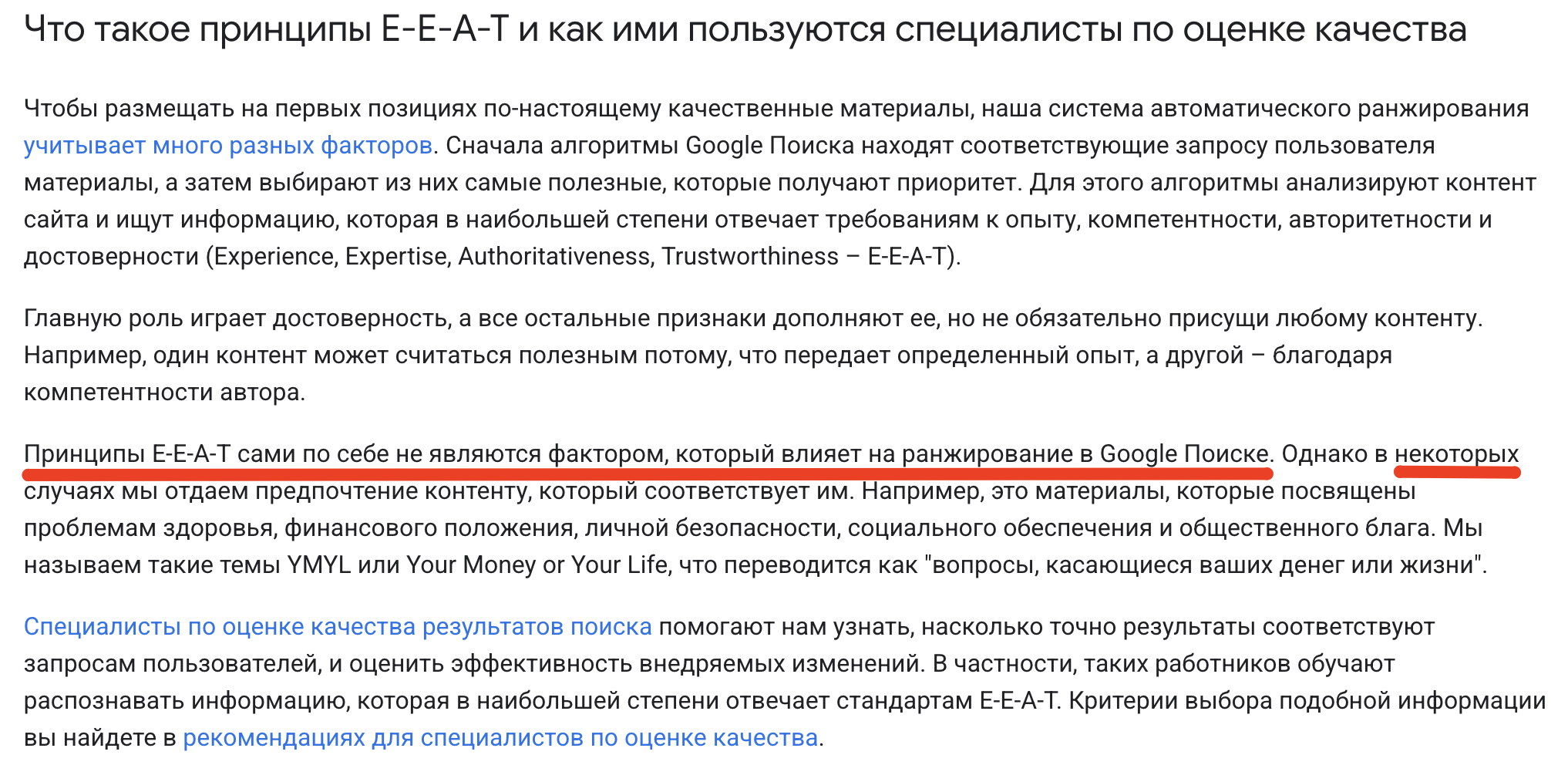 Принципы E-E-A-T сами по себе не являются фактором, который влияет на ранжирование в Google Поиске. Однако в некоторых случаях мы отдаем предпочтение контенту, который соответствует им.