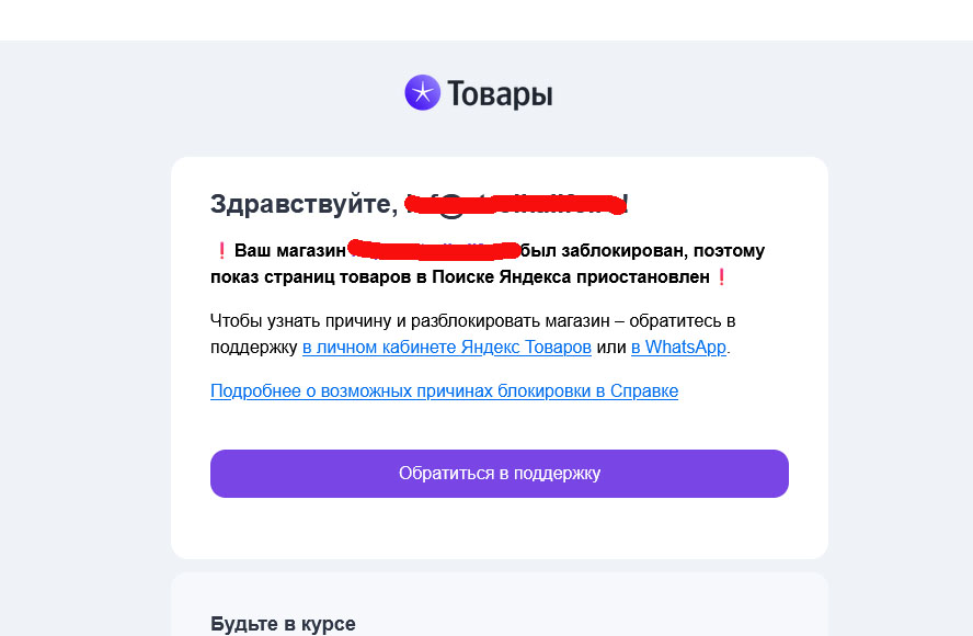 Ваш магазин (мой-URL) был заблокирован, поэтому показ страниц товаров в Поиске Яндекса приостановлен.