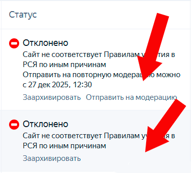 Как это понимать? Т.е. сайт не в статусе "Заблокирован", а в статусе "Отклонен", но перемодерация невозможна..