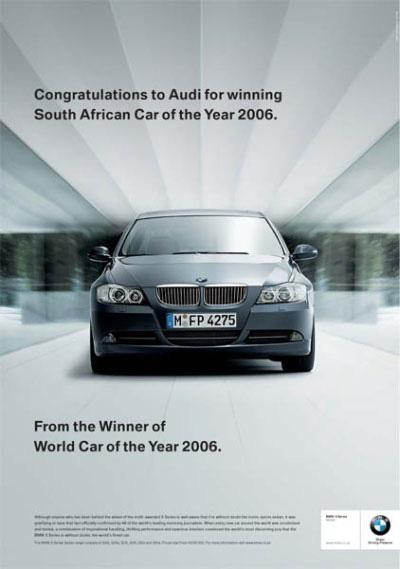Все началось с принта BMW: автогигант «мило» поздравлял Audi с победой в конкурсе «Машина года»-2006 в Южной Африке, подписавшись «Победитель конкурса «Машина мира»-2006.