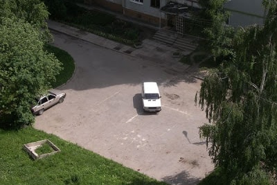 Фото двух летней давности. Я тогда ездил на Дэу - она то и припаркована в углу. Приехала женщина и запарковалась как показано на фото. Причем на всей площадке была только моя машина и больше ничего. Изящно припаркованная семерка простояла так около часа :)