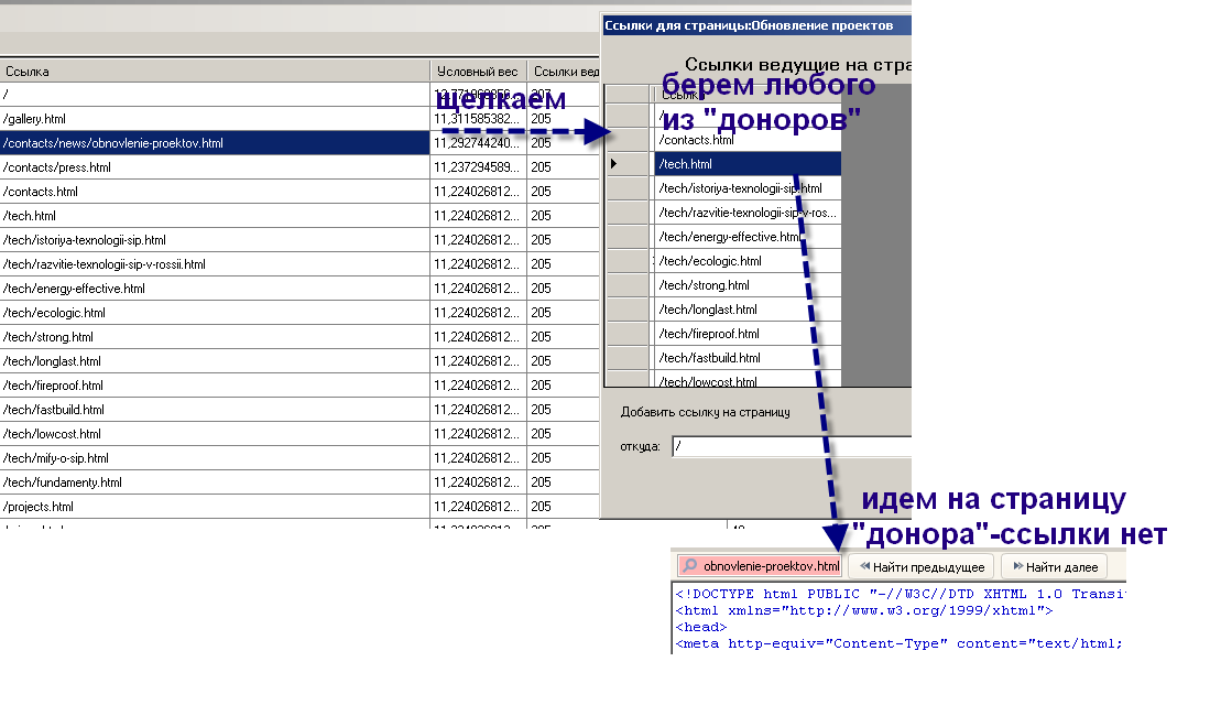 И еще. Не стоит оценивать потенциальный вес страницы только по количеству доноров. Можно и одной ссылкой передать столько веса, что мама не горюй, а можно и кучей доноров не отдать ничего. Внутреннее ссылочное сайта, особенно многостраничного, довольно сложная система, понять которую (в смысле уложить в голове что, как, откуда и почему) далеко не всегда представляется возможным. Собственно поэтому программа и создавалась - что бы не ломать голову, а увидеть своими глазами.