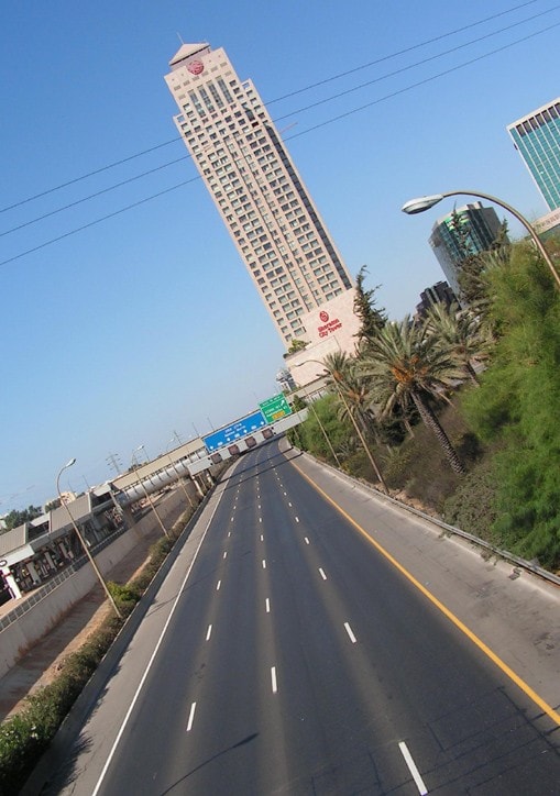 Въезд в Тель-Авив. (Сзади - самый высокий небоскреб на Ближнем Востоке)