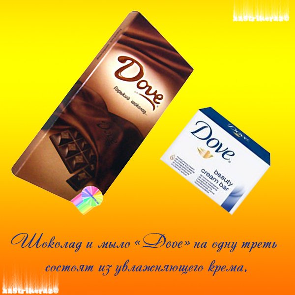 Сегодня зашел в магазин купить продуктов, и мой взор несаянно упал на шокладку под названием "Dove", это название мне показалось знакомым, но я так и не всомнил откуда я его знаю. Придя домой и включив телик, увидел рекламу мыла(угадайте как называется))), которое на треть состоит из увлажняющего крема. Не понимаю, неужели у производителей такая скудная фантазия, и они не могут придумать разные названия своих товаров? У меня этот шоколад теперь с увлажняющим кремом ассоциируется.