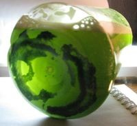 В бокале редкий напиток выглядел ярко зеленым и пенистым.