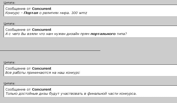 Просто я больше чем уверен, организаторы конкурса не имеют опыта работы с дизайнерами, потому что я, понимаю мысль Joe Ardison, что макет так сказать "рыбный", а организатор уже видит в макете свой "портал" и его это не устраивает... я так понял организаторы хотят все в плоть до запятых по пикселям выставить, но это не правильно, какие же тогда могут быть доработки и конкурсы ? Это уже сообщество рабов дизайнеров получается за 300 у.е., и вот еще, если я взял тематические тексты в качестве рыбы - это уже воровство и т.п., а религиозные знаки ? я допустим не увлекался никогда религиями мира, а меня упрекают, что я поставил знаки великих религий с сектантскими знаками рядом... хотя я объяснил что шапка сырая, но заказчику все ровно, он не может нормально сформулировать задание, а лично я, не могу читать его мысли и методом тыка, делать 10 дизайнов, что моя работа попала под рассмотрение...