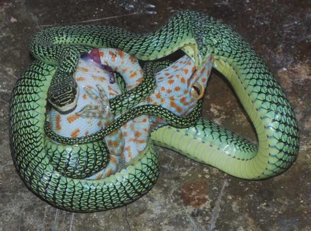геккон (большой длиной с мою руку до локтя примерно) со змеей дерется
