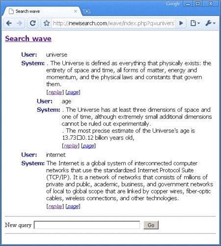 Разрешите представить на суд свое очередное видение поиска 2.0. Идея возникла под влиянием двух сервисов: планируемого Google wave и недавно запущенного Wolfram alpha. Суть в следующем: организовать поиск информации в Интернет как волны - вводим запрос, получаем ответ. Есть поля ввода рядом с ответом и с новой строчки. В первом случае поиск производится в контексте ответа, во втором - в новом. Выглядит почти как деревовидный форум. Т.е. получаем форум с двумя участниками - пользователь и система. Вот такой: