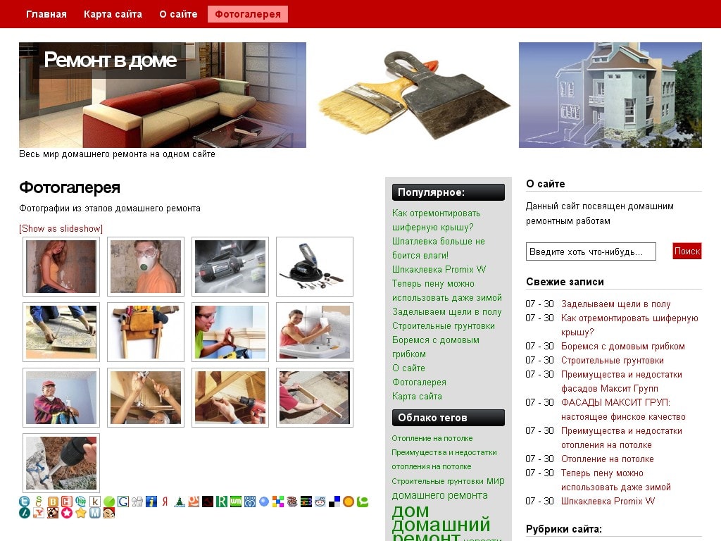 12 записей, 15 меток, 3 страницы, 2 рубрики, у всех страниц прописаны заголовки, описания и ключевые слова. Также присутвуют страницы - О сайте, Фотогалерея, Карта сайта. Фотогалерея имеет 13 изображений с прописанными альтами, тайтлами и описаниями.