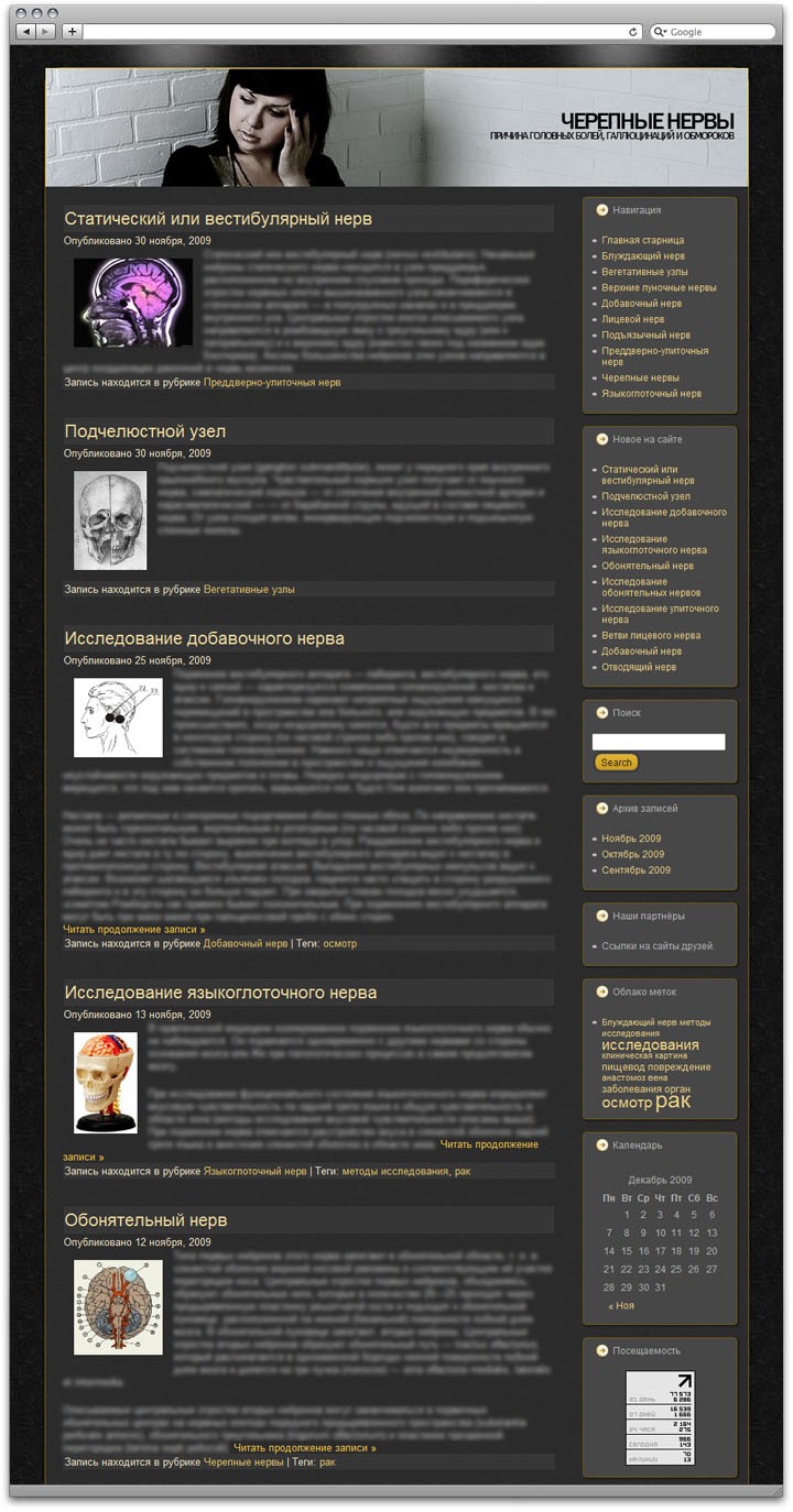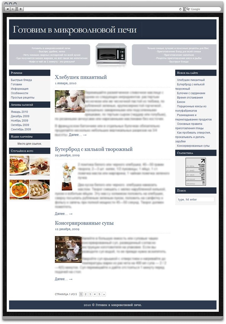 Записи - 45, из них опубликовано 33 и 12 запланированы до конца января 2010 (сайт будет обновляться автоматически!) + к каждой записи добавлена тематическая картинка (у каждой прописан alt), разбиты на 5 рубрик, в записях проставлены метки - 228.