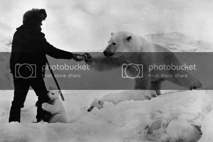 Да, фотка трогательная, но неправдоподобная. Много раз слышала, что белые медведи очень опасны, а особенно - медведица с потомством. Да и звери вроде, если хотят что-то взять, тянутся пастью, а не лапой. А она, кажись, банку лапой брать собралась?🙄