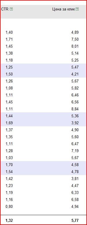 Вот средние показатели за прошедшую неделю (ПТ включен): Москва - 4,6 рубля за клик, Петербург - 4,3 р., Нижний Новгород - 1,7 р., Екатеринбург - 0,6 р., Казань - 1,8 р, остальные - 1,1 р. Вообщем, как уже говорилось (/ru/forum/comment/6208321, спасибо за подсказку), московский и питерский трафик намного выгоднее, теперь сам убедился.