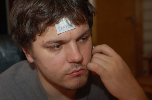 нашла у себя интересную серию портретов. Они были сделаны, когда мы на Новый Год играли в игру из тарантиновских "Бесславных ублюдков". Игроки пишут на бумажках имена разных героев и лепят друг другу на лоб. С целью угадать, кем его обозвали, человек должен задавать вопросы и в конце концов угадать имя на бумажке