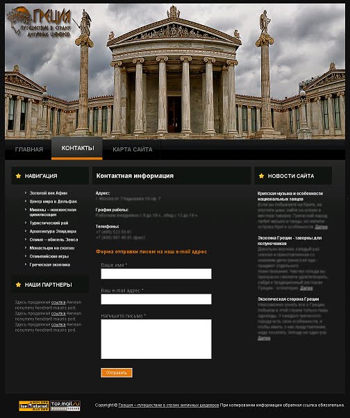 Управление: На файлах HTML, без CMS. С подключением блока keywords, навигации по сайту, последних новостей, блока ссылок, и подвала. Каждый подключаемый блок вынесен в отдельные файлы. Есть favicon, карта сайта и страница контактов с нормально функционирующей формой обратной связи.