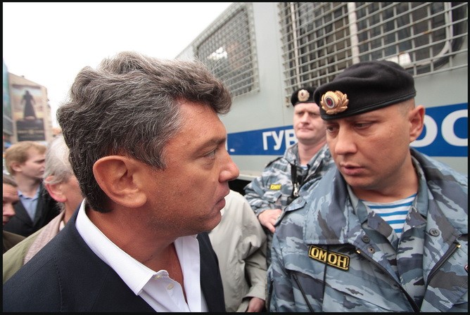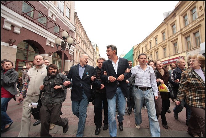 22.08.2010 13:59 : Сопредседатель движения "Солидарность" Борис Немцов и активист организации Михаил Шнейдер задержаны на акции оппозиции в честь Дня российского флага за попытку пронести флаг по Новому Арбату