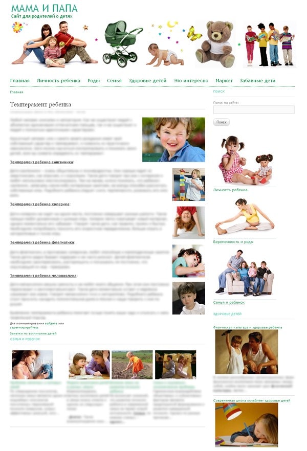 Дизайн: уникальный, фавикон, иллюстрации ко всем статьям. Текст каждой статьи отформатирован вручную. Фотогалерея с детскими фото-приколами.