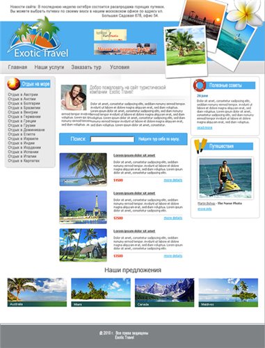 Пожелание - использовать яркие цвета, картинки с морем, пальмами и т.п., чтобы посетителям захотелось купить тур на море.