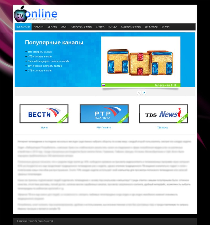 Продам не доделанный сайт ТВ онлайн на html без хостинга и домена. В принципе он доделанный, но некоторые категории пустые.