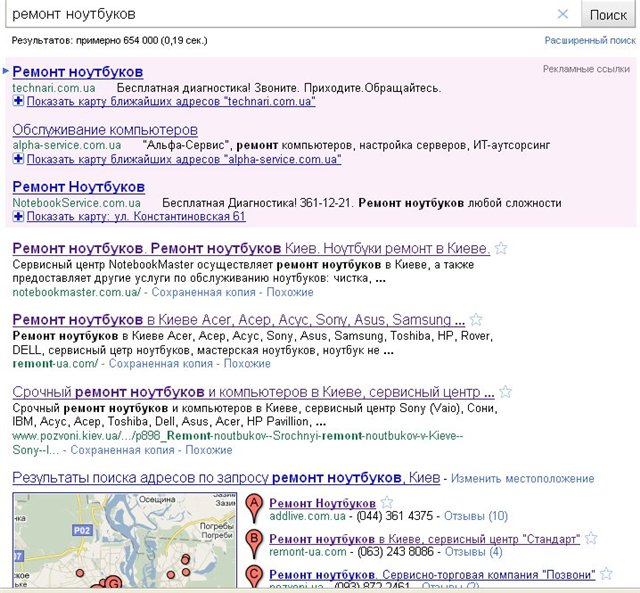 например, вбиваешь фразу в поисковик гугла, покаызваются рекламные объявления, потом 1-2 тех, что на первых позициях, а потом несколько тех, кто на карте гугла.