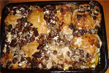 И чтоб не оффтопить: слегка обжаренные окорочка, лук и грибы заливаем домашними сливками и тушим в духовке.