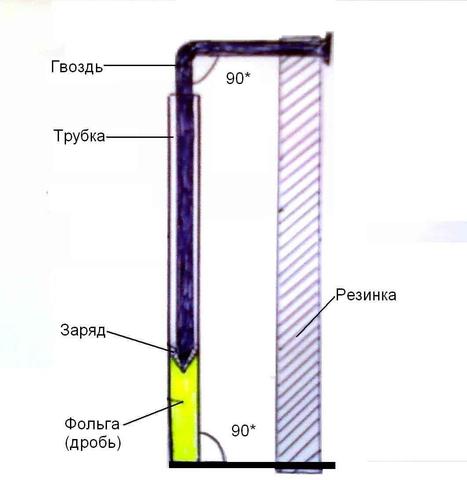 Фагот, как я понял тут нужно натягивать гвозь привязанный к резинке, отпустить, он стукает по заряду происходит щелчек,хлопок,искра,отрывание руки???