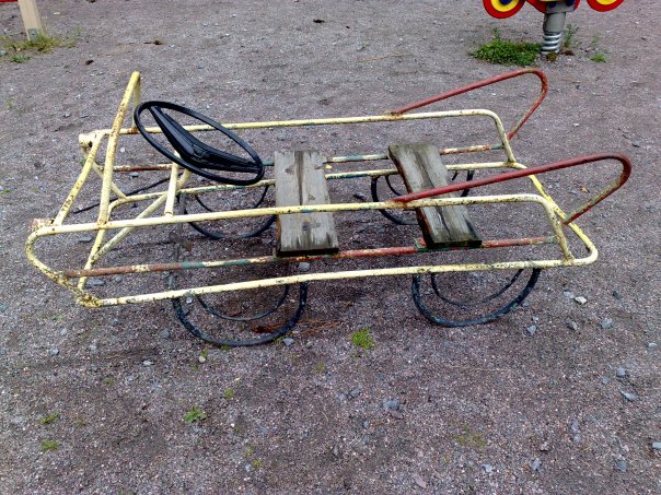 Вспомнил металические "машины" вкопанные в землю-обычно в дет.садах стояли и стоят по сей день:
