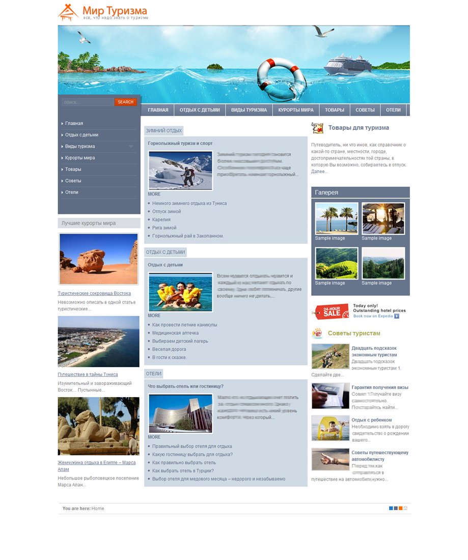 Разделы: Отдых с детьми, Виды туризма (зимний и морской), Лучшие курорты мира (30шт), Товары для туризма, Советы туристам, Отели и гостиницы.