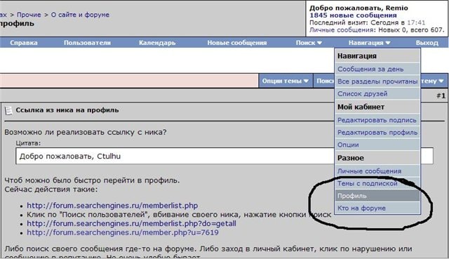 Ctulhu, щелкаете на свой ник и "посмотреть профиль" не катит? В 2 клика посмотрел ваш профиль.